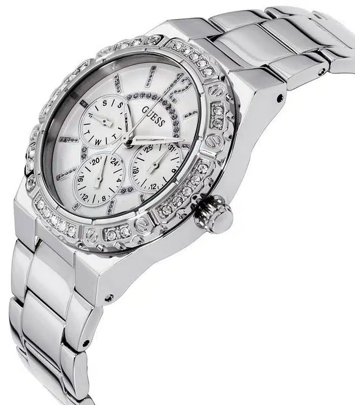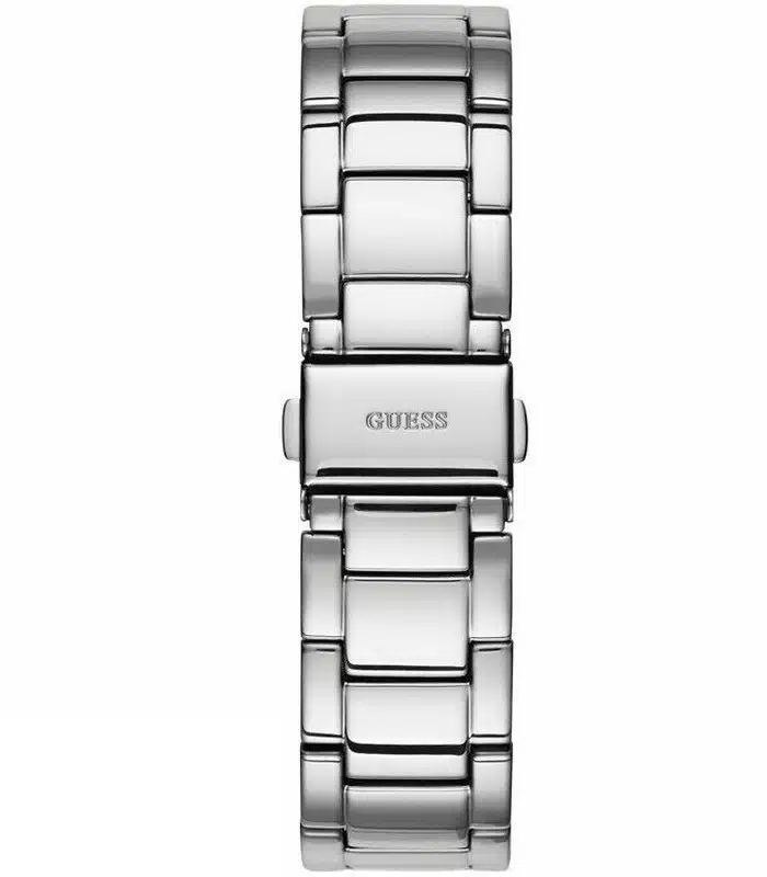Montre pour Femme de la Marque : Guess – Référence : W0845L1 – Fonctionnalités : Chronographe – Mouvement : Quartz – Matière du boîtier : Acier inoxydable – Diamètre du boîtier : 36 mm – Matière du bracelet : Acier inoxydable – Largeur du bracelet : 18 mm – Type de verre : Minéral – Garantie : 2 ans Livré avec son coffret original, sac et certificat d’authenticité.