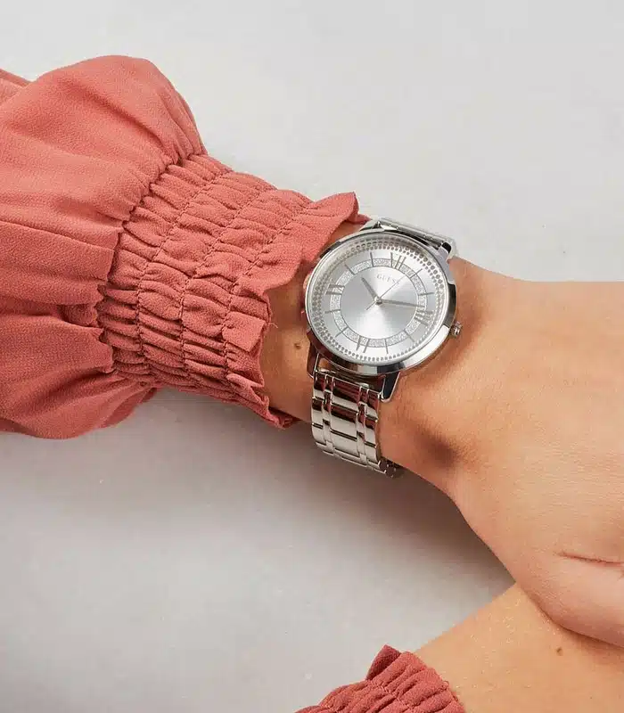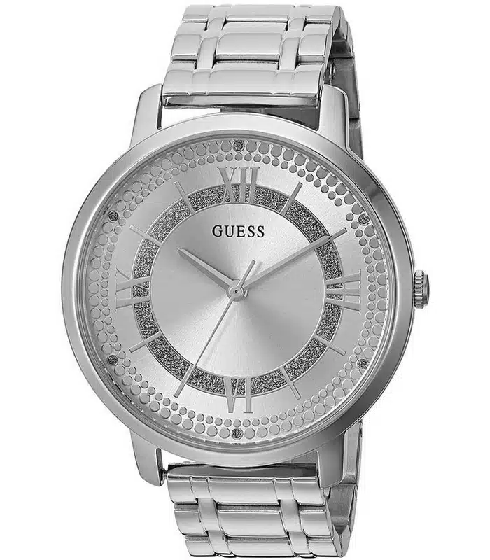 Montre pour Femme de la Marque : Guess – Référence : W0933L1 – Fonctionnalités : Analogique – Mouvement : Quartz – Matière du boîtier : Acier inoxydable – Diamètre du boîtier : 40 mm – Matière du bracelet : Acier inoxydable – Largeur du bracelet : 18 mm – Type de verre : Minéral – Garantie : 2 ans Livré avec son coffret original, sac et certificat d’authenticité.