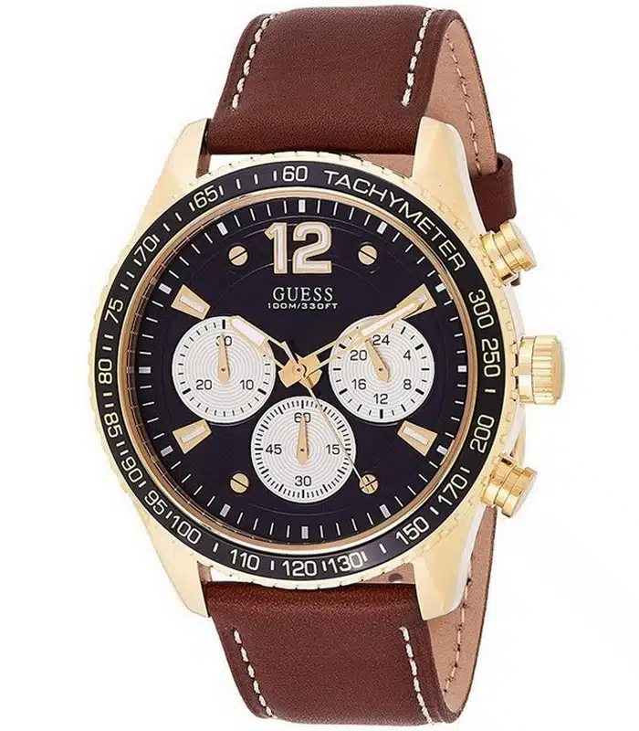 Montre pour Homme de la Marque : Guess – Référence : W0970G2 – Fonctionnalités : Chronographe – Mouvement : Quartz – Matière du boîtier : Acier inoxydable – Diamètre du boîtier : 44 mm – Matière du bracelet : Cuir – Largeur du bracelet : 21 mm – Type de verre : Minéral – Garantie : 2 ans Livré avec son coffret original, sac et certificat d’authenticité.