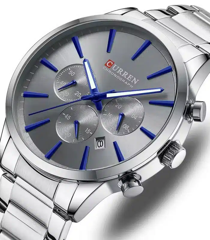 Montre pour Homme de la Marque : Curren – Référence : 8435 Argent – Fonctionnalités : Chronographe – Mouvement : Quartz – Matière du boîtier : Acier inoxydable – Diamètre du boîtier : 45 mm – Matière du bracelet : Acier inoxydable – Largeur du bracelet : 22 mm – Type de verre : Minéral – Garantie : 1 an Livré avec son coffret original et certificat d’authenticité.