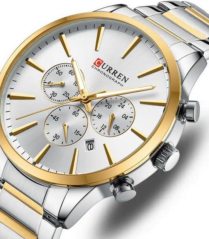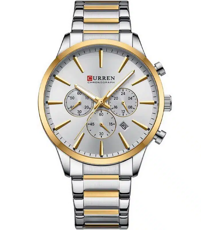 Montre pour Homme de la Marque : Curren – Référence : 8435 Doré – Fonctionnalités : Chronographe – Mouvement : Quartz – Matière du boîtier : Acier inoxydable – Diamètre du boîtier : 45 mm – Matière du bracelet : Acier inoxydable – Largeur du bracelet : 22 mm – Type de verre : Minéral – Garantie : 1 an Livré avec son coffret original et certificat d’authenticité.