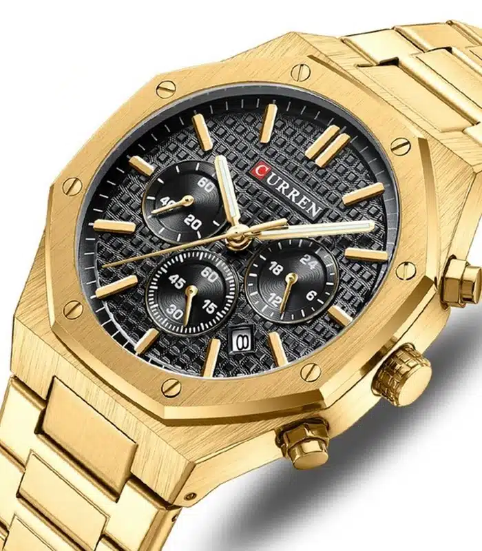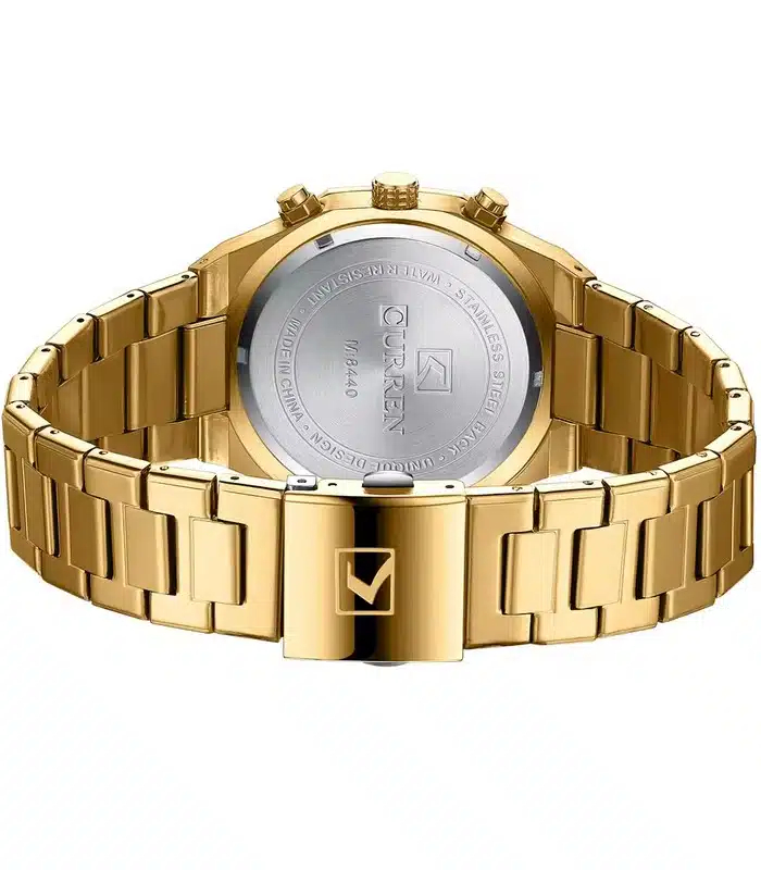 Montre pour Homme de la Marque : Curren – Référence : 8440 Doré – Fonctionnalités : Chronographe – Mouvement : Quartz – Matière du boîtier : Acier inoxydable – Diamètre du boîtier : 43 mm – Matière du bracelet : Acier inoxydable – Largeur du bracelet : 22 mm – Type de verre : Minéral – Garantie : 1 an Livré avec son coffret original et certificat d’authenticité.