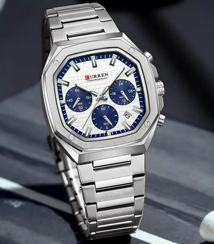 Montre pour Homme de la Marque : Curren – Référence : 8459 Argent – Fonctionnalités : Chronographe – Mouvement : Quartz – Matière du boîtier : Acier inoxydable – Diamètre du boîtier : 39 mm – Matière du bracelet : Acier inoxydable – Largeur du bracelet : 20 mm – Type de verre : Minéral – Garantie : 1 an Livré avec son coffret original et certificat d’authenticité.