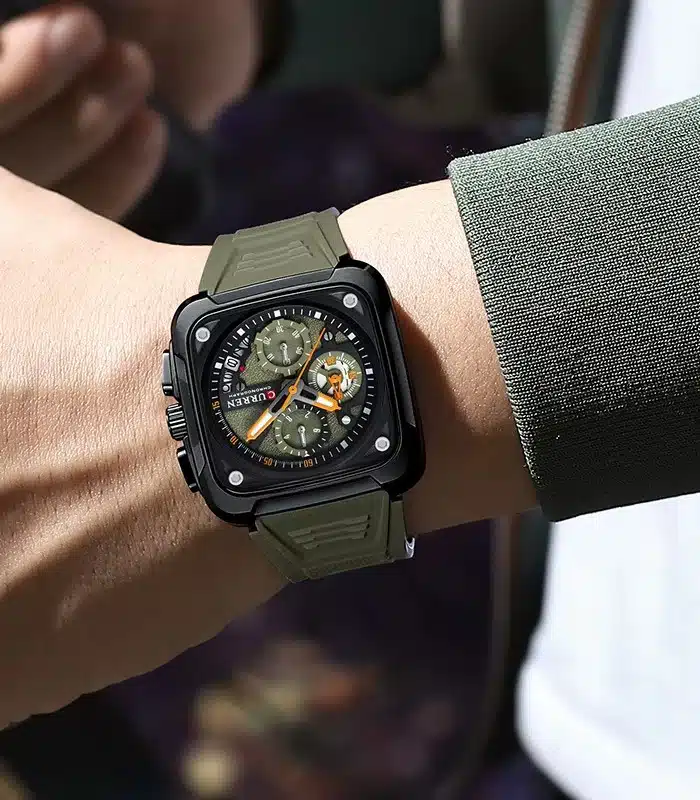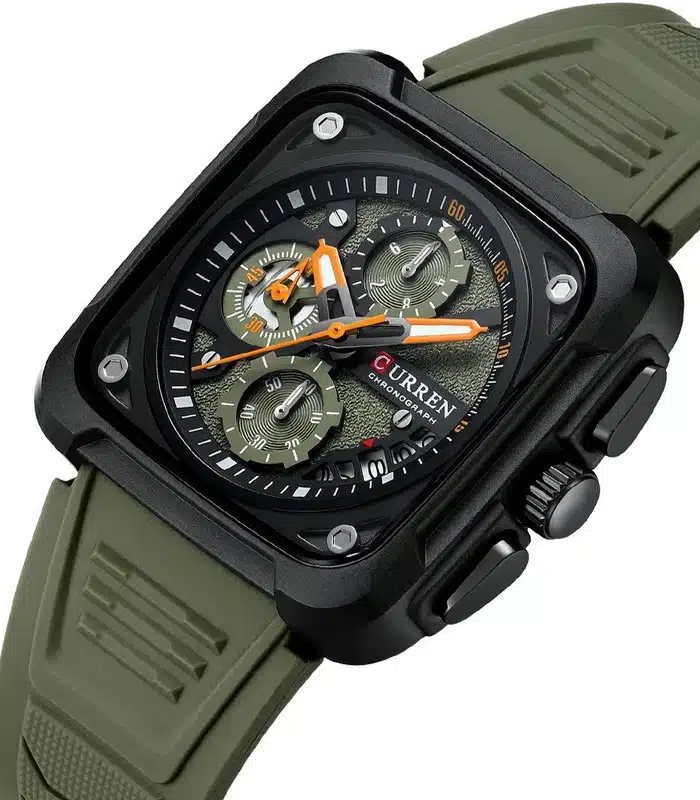 Montre pour Homme de la Marque : Curren – Référence : 8461 Vert – Fonctionnalités : Chronographe – Mouvement : Quartz – Matière du boîtier : Acier inoxydable – Diamètre du boîtier : 42 mm – Matière du bracelet : Silicone – Largeur du bracelet : 23 mm – Type de verre : Minéral – Garantie : 1 an Livré avec son coffret original et certificat d’authenticité.