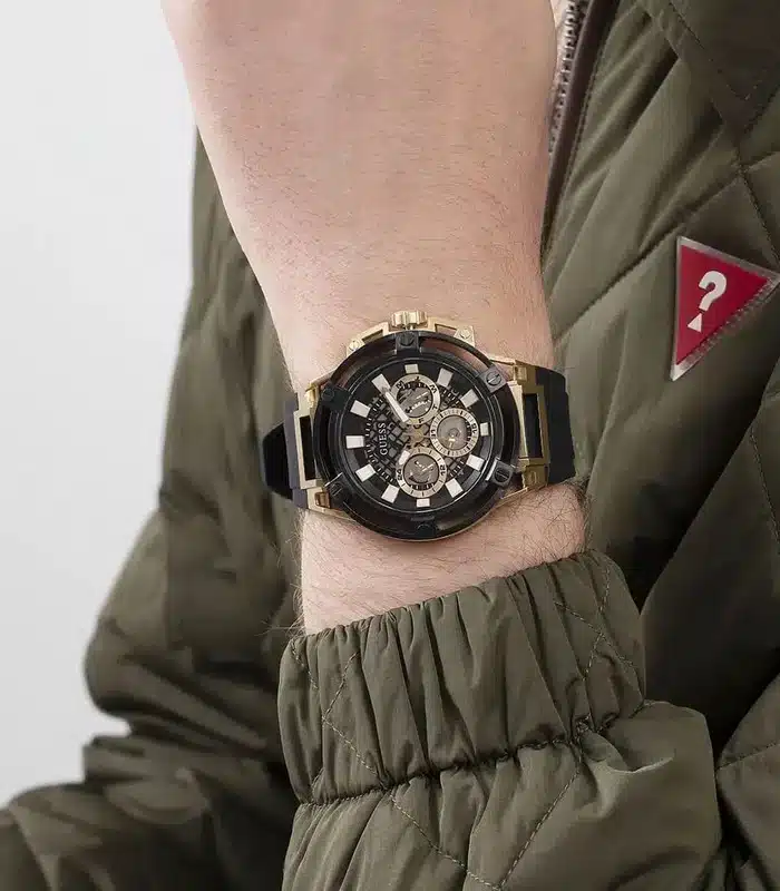 Montre pour Homme de la Marque : Guess – Référence : GW0423G2 – Fonctionnalités : Chronographe – Mouvement : Quartz – Matière du boîtier : Acier inoxydable – Diamètre du boîtier : 46 mm – Matière du bracelet : Silicone – Largeur du bracelet : 22 mm – Type de verre : Minéral – Garantie : 2 ans Livré avec son coffret original, sac et certificat d’authenticité.