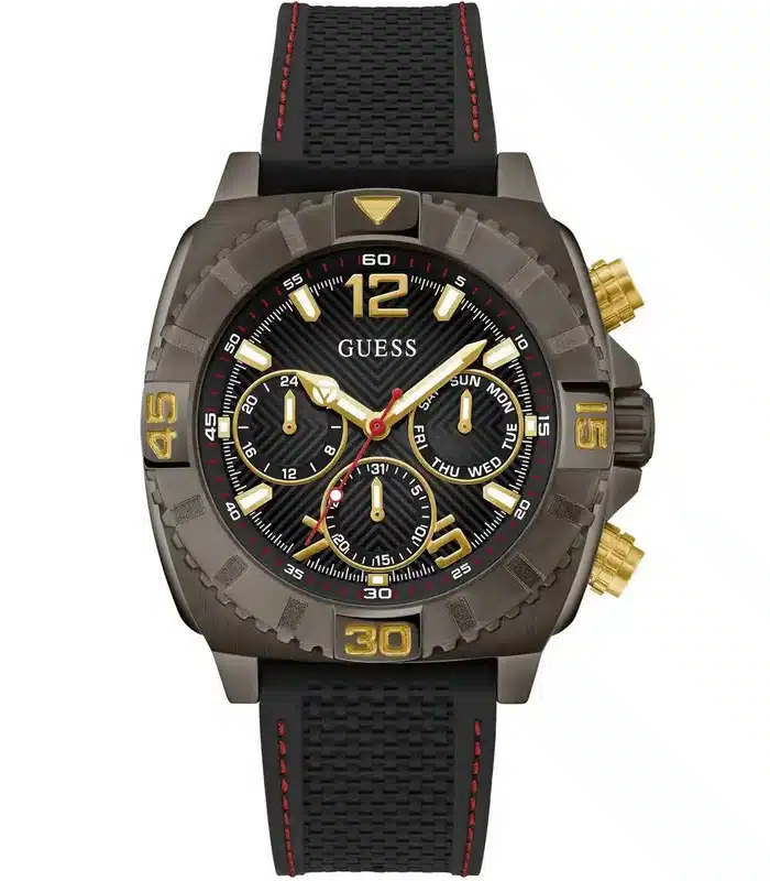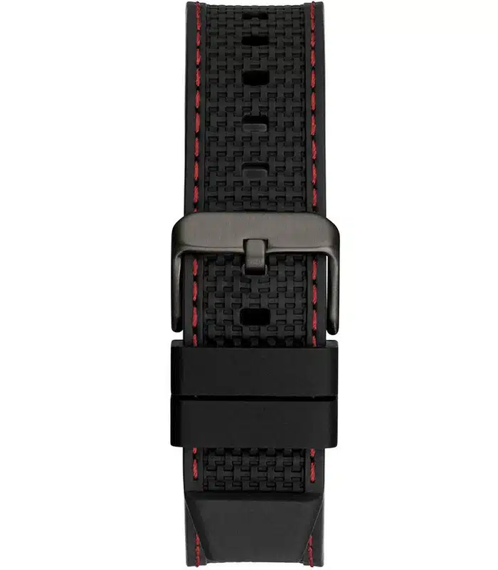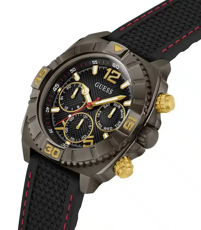 Montre pour Homme de la Marque : Guess – Référence : GW0801G2  – Fonctionnalités : Chronographe – Mouvement : Quartz – Matière du boîtier : Acier inoxydable – Diamètre du boîtier : 46 mm – Matière du bracelet : Silicone – Largeur du bracelet : 22 mm – Type de verre : Minéral – Garantie : 2 ans Livré avec son coffret original, sac et certificat d’authenticité.