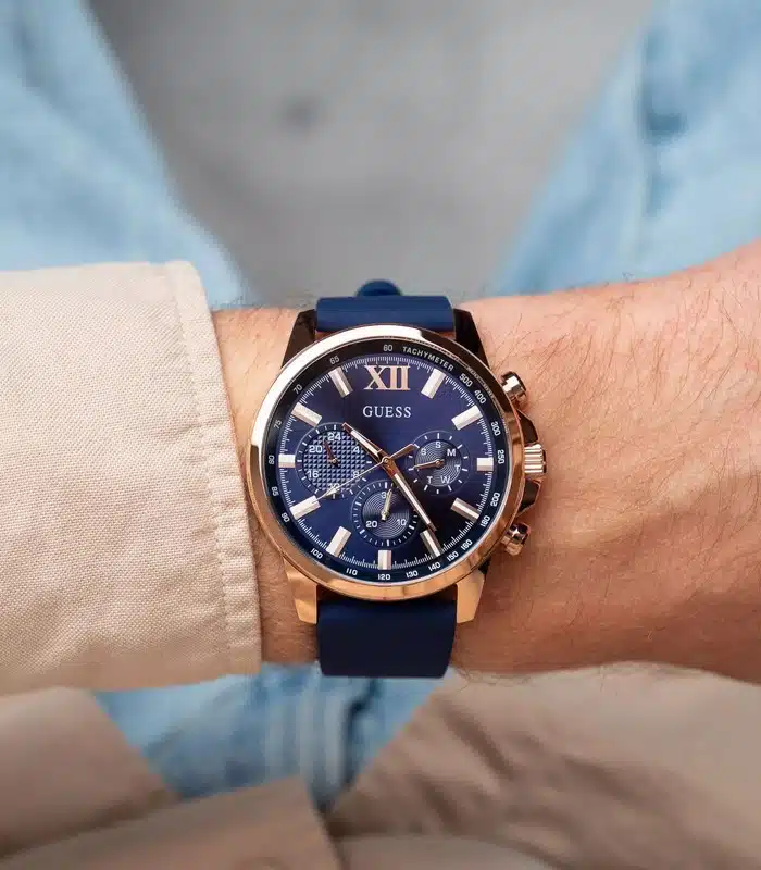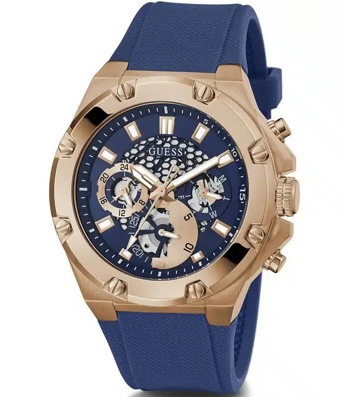 Montre pour Homme de la Marque : Guess – Référence : GW0334G3 – Fonctionnalités : Chronographe – Mouvement : Quartz – Matière du boîtier : Acier inoxydable – Diamètre du boîtier : 46 mm – Matière du bracelet : Silicone – Largeur du bracelet : 22 mm – Type de verre : Minéral – Garantie : 2 ans Livré avec son coffret original, sac et certificat d’authenticité.