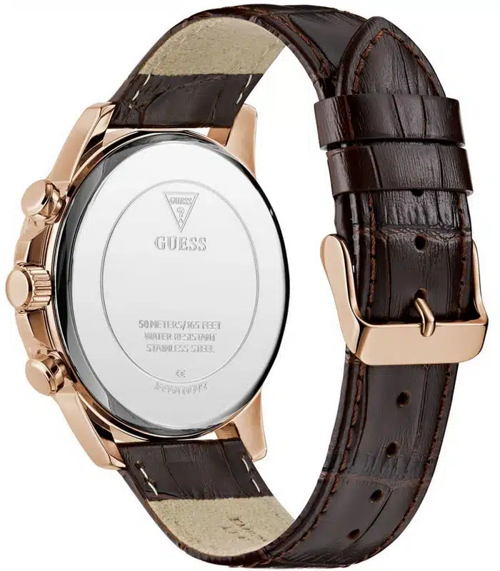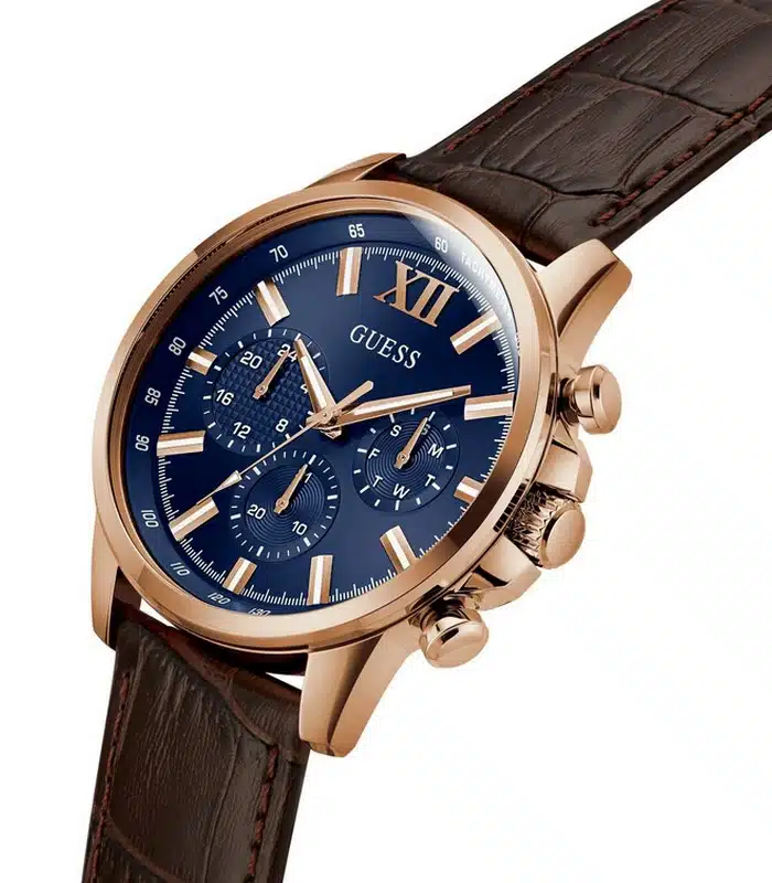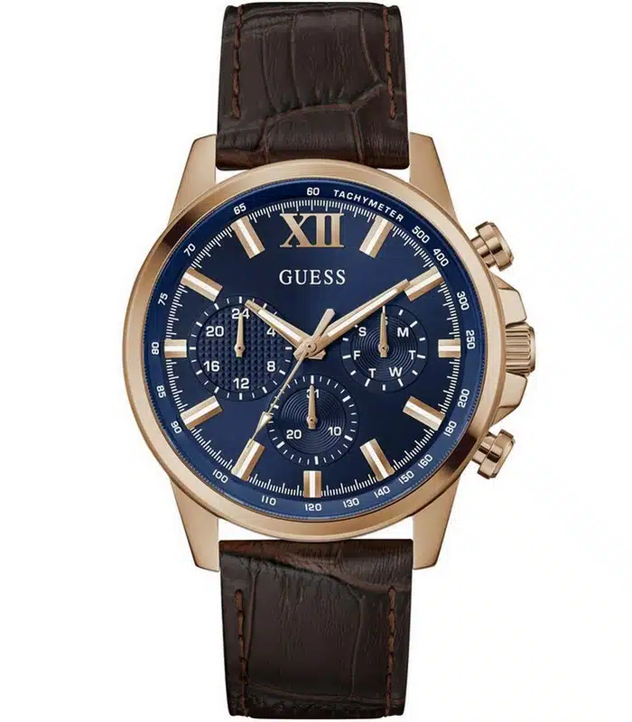 Montre pour Homme de la Marque : Guess – Référence : GW0901G3 – Fonctionnalités : Chronographe – Mouvement : Quartz – Matière du boîtier : Acier inoxydable – Diamètre du boîtier : 44 mm – Matière du bracelet : Cuir – Largeur du bracelet : 22 mm – Type de verre : Minéral – Garantie : 2 ans Livré avec son coffret original, sac et certificat d’authenticité.
