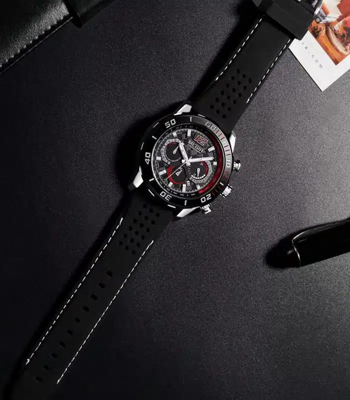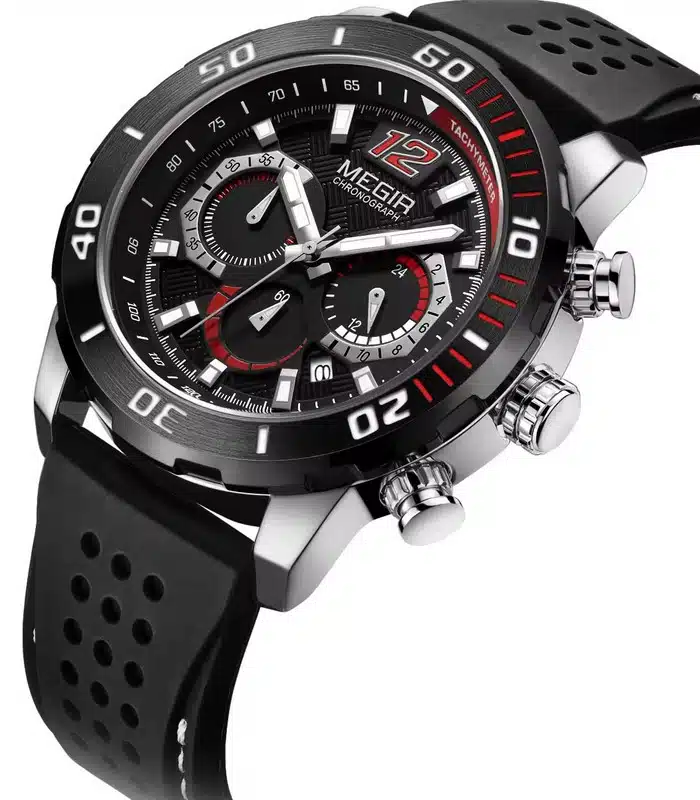 Montre pour Homme de la Marque : Megir – Référence : 2109 Noir – Fonctionnalités : Chronographe – Mouvement : Quartz – Matière du boîtier : Acier inoxydable – Diamètre du boîtier : 46 mm – Matière du bracelet : Silicone – Largeur du bracelet : 22 mm – Type de verre : Minéral – Garantie : 1 ans Livré avec son coffret original, sac et certificat d’authenticité.