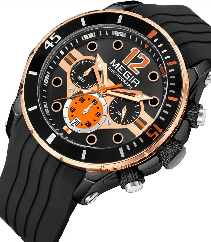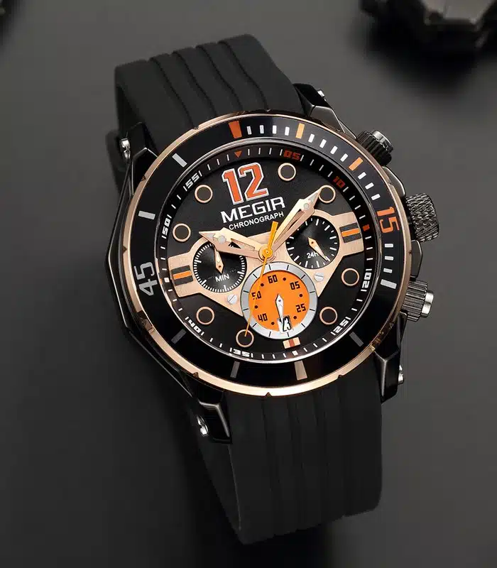 Montre pour Homme de la Marque : Megir – Référence : 2206 Noir – Fonctionnalités : Chronographe – Mouvement : Quartz – Matière du boîtier : Acier inoxydable – Diamètre du boîtier : 46 mm – Matière du bracelet : Silicone – Largeur du bracelet : 24 mm – Type de verre : Minéral – Garantie : 1 ans Livré avec son coffret original, sac et certificat d’authenticité.