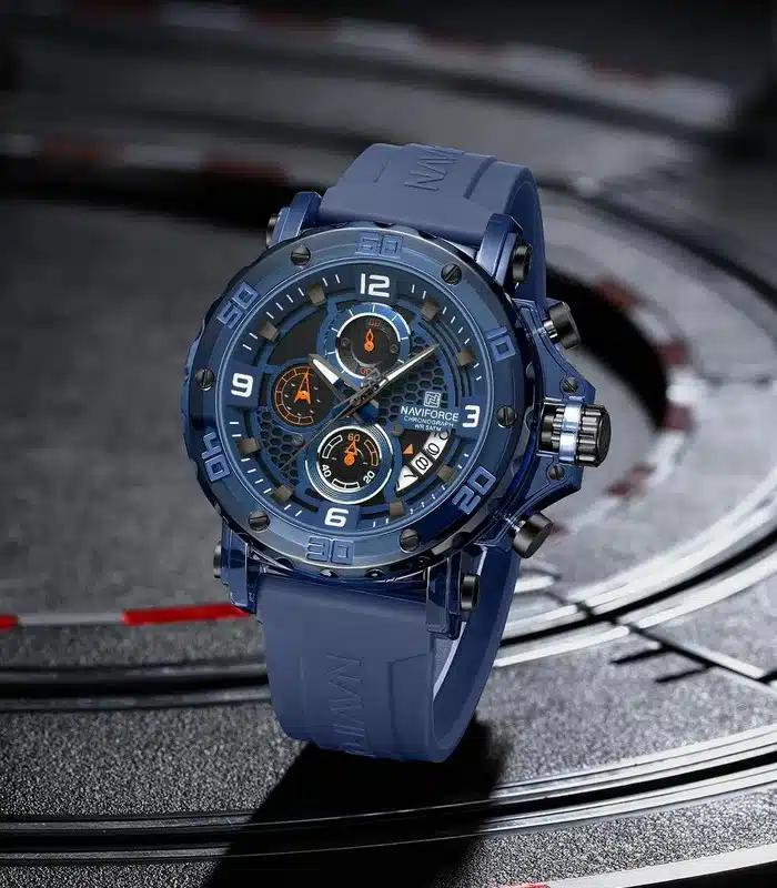Montre pour Homme de la Marque : Naviforce – Référence : NF7123 Bleu – Fonctionnalités : Chronographe – Mouvement : Quartz – Matière du boîtier : Acier inoxydable – Diamètre du boîtier : 47 mm – Matière du bracelet : Silicone – Largeur du bracelet : 24 mm – Type de verre : Minéral – Garantie : 1 an Livré avec son coffret original et certificat d’authenticité.
