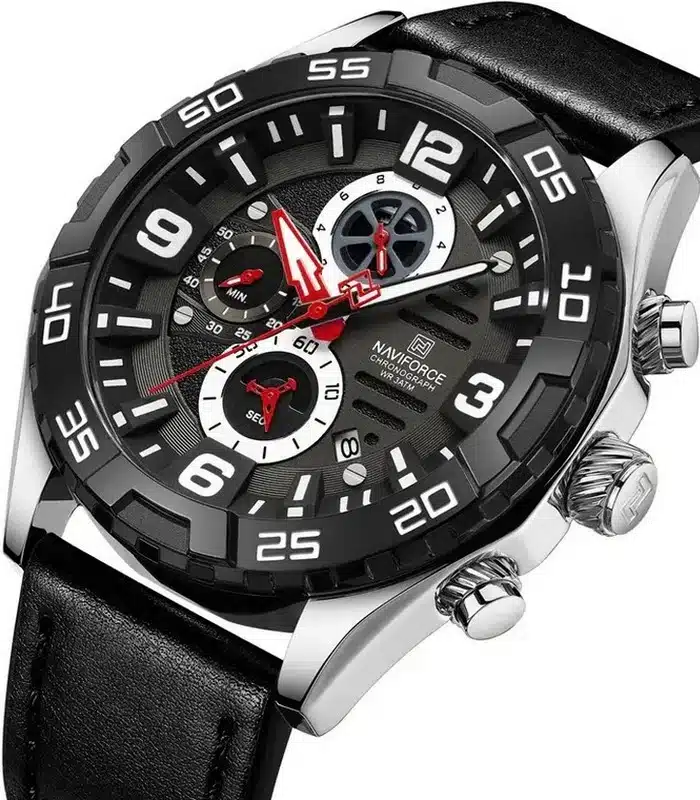 Montre pour Homme de la Marque : Naviforce – Référence : NF8043 Noir – Fonctionnalités : Chronographe – Mouvement : Quartz – Matière du boîtier : Acier inoxydable – Diamètre du boîtier : 46 mm – Matière du bracelet : Cuir – Largeur du bracelet : 22 mm – Type de verre : Minéral – Garantie : 1 an Livré avec son coffret original et certificat d’authenticité.