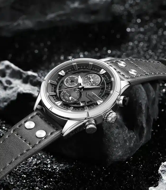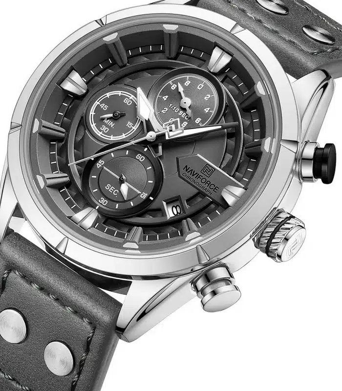 Montre pour Homme de la Marque : Naviforce – Référence : NF8045 Argent – Fonctionnalités : Chronographe – Mouvement : Quartz – Matière du boîtier : Acier inoxydable – Diamètre du boîtier : 44 mm – Matière du bracelet : Cuir – Largeur du bracelet : 22 mm – Type de verre : Minéral – Garantie : 1 an Livré avec son coffret original et certificat d’authenticité.