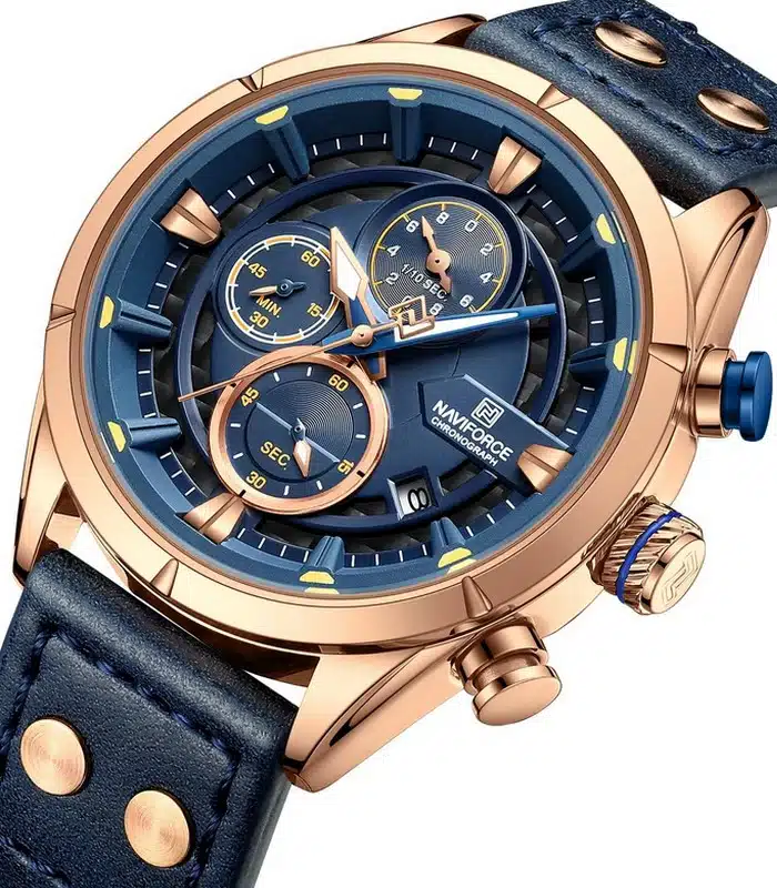 Montre pour Homme de la Marque : Naviforce – Référence : NF8045 Bleu – Fonctionnalités : Chronographe – Mouvement : Quartz – Matière du boîtier : Acier inoxydable – Diamètre du boîtier : 44 mm – Matière du bracelet : Cuir – Largeur du bracelet : 22 mm – Type de verre : Minéral – Garantie : 1 an Livré avec son coffret original et certificat d’authenticité.