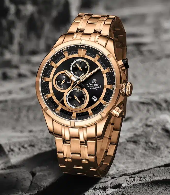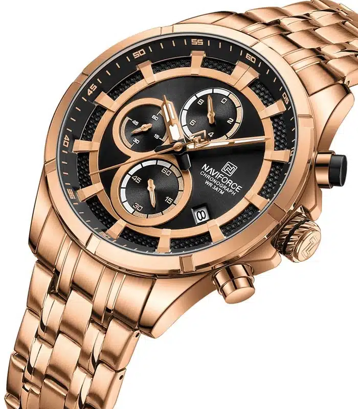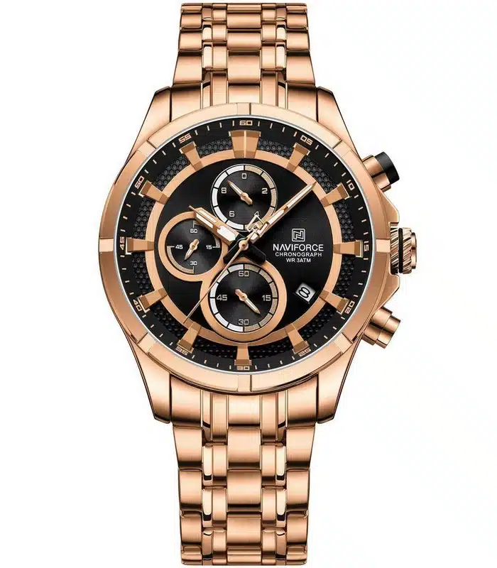 Montre pour Homme de la Marque : Naviforce – Référence : NF8046 Rosé – Fonctionnalités : Chronographe – Mouvement : Quartz – Matière du boîtier : Acier inoxydable – Diamètre du boîtier : 44 mm – Matière du bracelet : Acier inoxydable – Largeur du bracelet : 22 mm – Type de verre : Minéral – Garantie : 1 an Livré avec son coffret original et certificat d’authenticité.