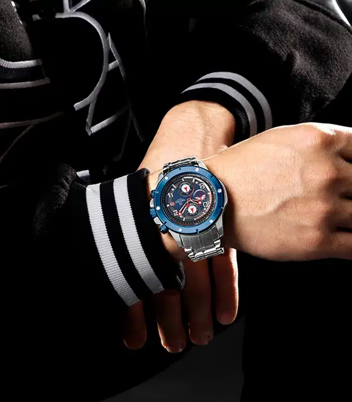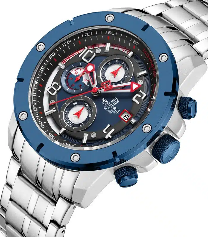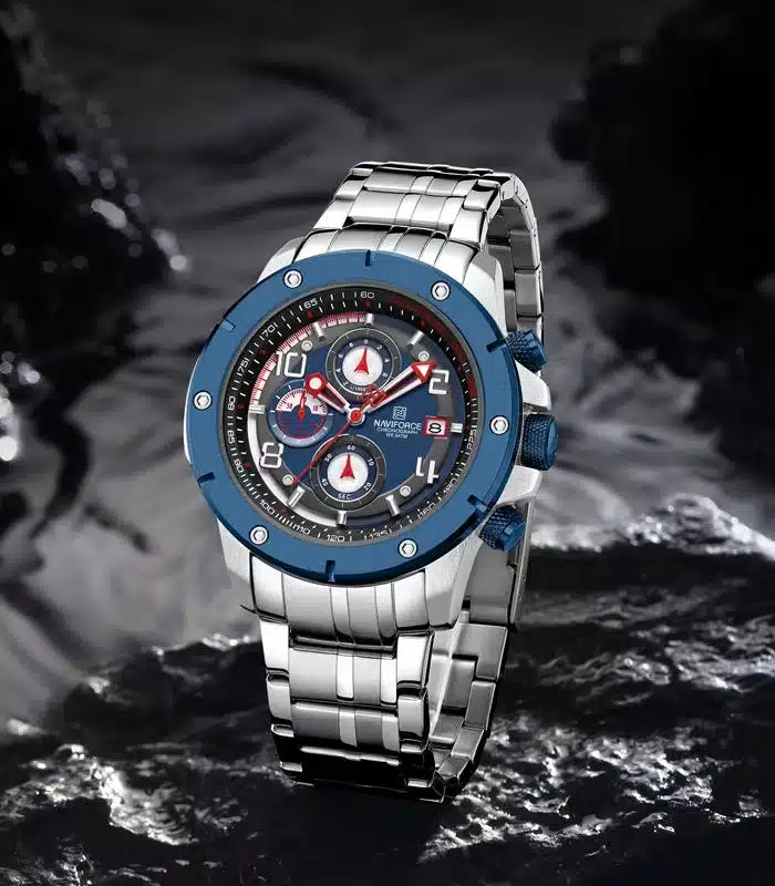 Montre pour Homme de la Marque : Naviforce – Référence : NF8056 Bleu – Fonctionnalités : Chronographe – Mouvement : Quartz – Matière du boîtier : Acier inoxydable – Diamètre du boîtier : 46 mm – Matière du bracelet : Acier inoxydable – Largeur du bracelet : 24 mm – Type de verre : Minéral – Garantie : 1 an Livré avec son coffret original et certificat d’authenticité.