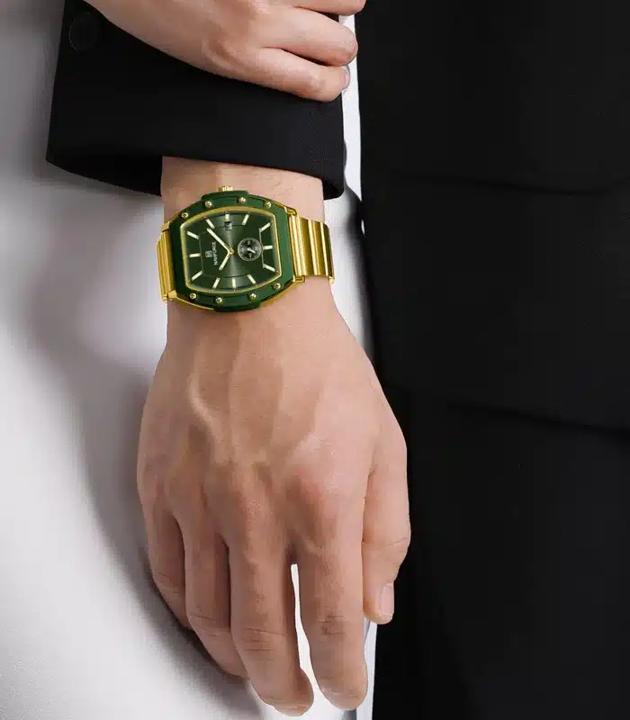 Montre pour Homme de la Marque : Naviforce – Référence : NF8068G Vert – Fonctionnalités : Chronographe – Mouvement : Quartz – Matière du boîtier : Acier inoxydable – Diamètre du boîtier : 43 mm – Matière du bracelet : Acier inoxydable – Largeur du bracelet : 22 mm – Type de verre : Minéral – Garantie : 1 an Livré avec son coffret original et certificat d’authenticité.