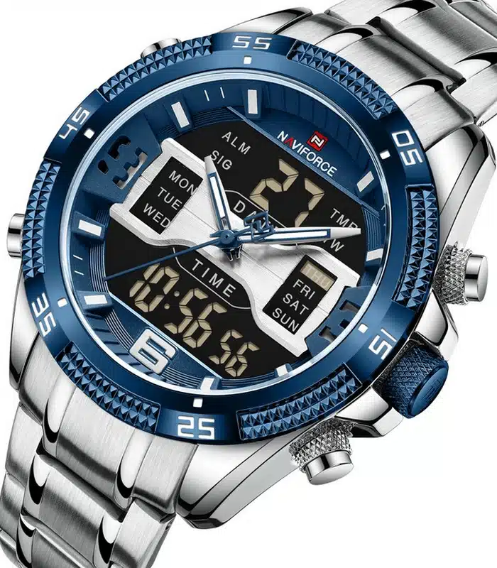 Montre pour Homme de la Marque : Naviforce – Référence : NF9201 Fond Bleu – Fonctionnalités : Automatique – Mouvement : Quartz – Matière du boîtier : Acier inoxydable – Diamètre du boîtier : 45 mm – Matière du bracelet : Acier inoxydable – Largeur du bracelet : 22 mm – Type de verre : Minéral – Garantie : 1 an Livré avec son coffret original et certificat d’authenticité.