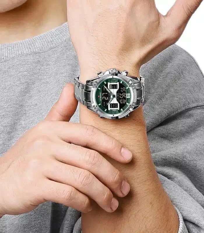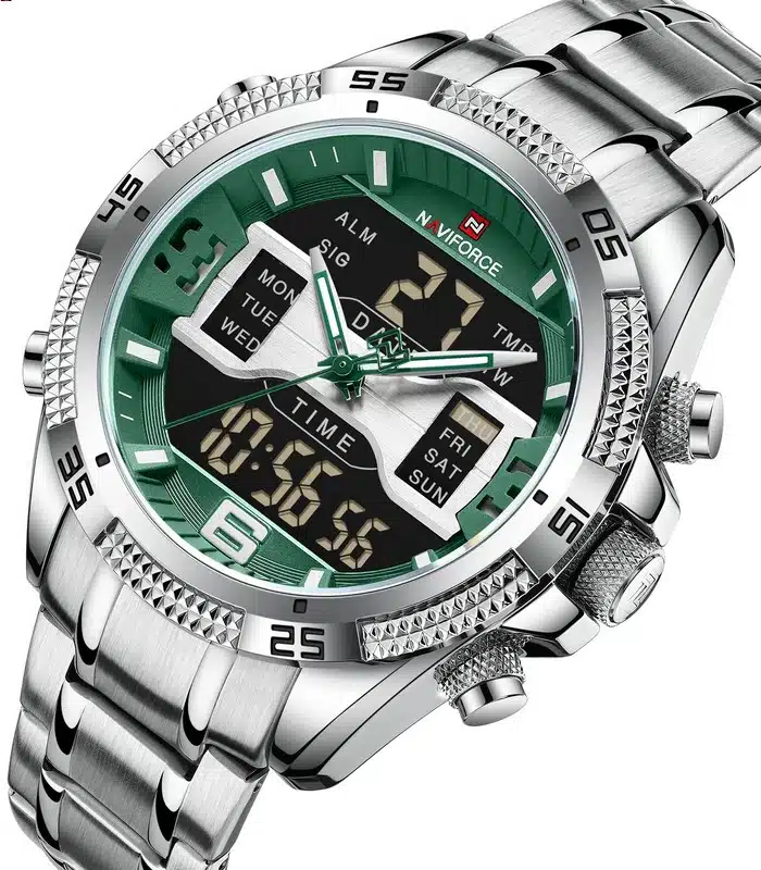 Montre pour Homme de la Marque : Naviforce – Référence : NF9201 Fond Vert – Fonctionnalités : Automatique – Mouvement : Quartz – Matière du boîtier : Acier inoxydable – Diamètre du boîtier : 45 mm – Matière du bracelet : Acier inoxydable – Largeur du bracelet : 22 mm – Type de verre : Minéral – Garantie : 1 an Livré avec son coffret original et certificat d’authenticité.