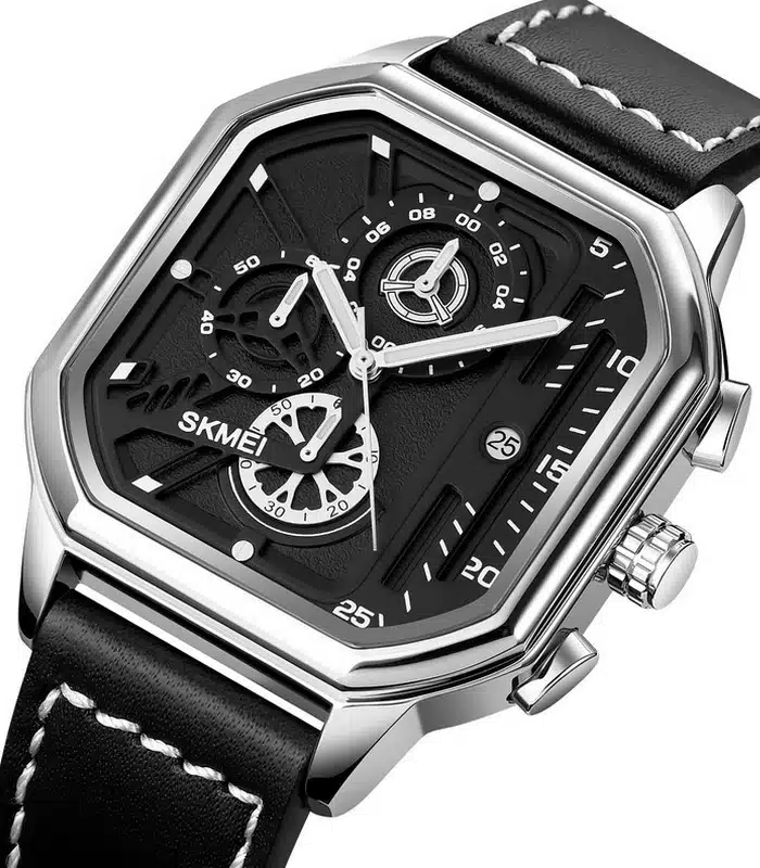 Montre pour Homme de la Marque : Skmei – Référence : 1963 Argent – Fonctionnalités : Chronographe – Mouvement : Quartz – Matière du boîtier : Acier inoxydable – Diamètre du boîtier : 42 mm – Matière du bracelet : Cuir – Largeur du bracelet : 20 mm – Type de verre : Minéral – Garantie : 1 an Livré avec son coffret original et certificat d’authenticité.