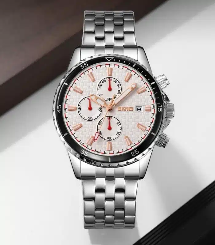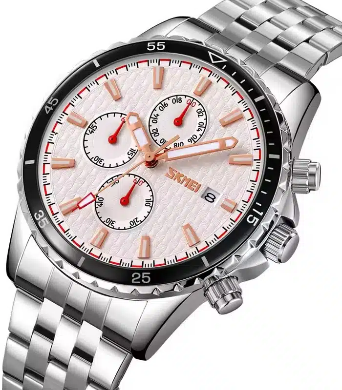 Montre pour Homme de la Marque : Skmei – Référence : 9334 Fond Blanc – Fonctionnalités : Chronographe – Mouvement : Quartz – Matière du boîtier : Acier inoxydable – Diamètre du boîtier : 46 mm – Matière du bracelet : Acier inoxydable – Largeur du bracelet : 22 mm – Type de verre : Minéral – Garantie : 1 an Livré avec son coffret original et certificat d’authenticité.